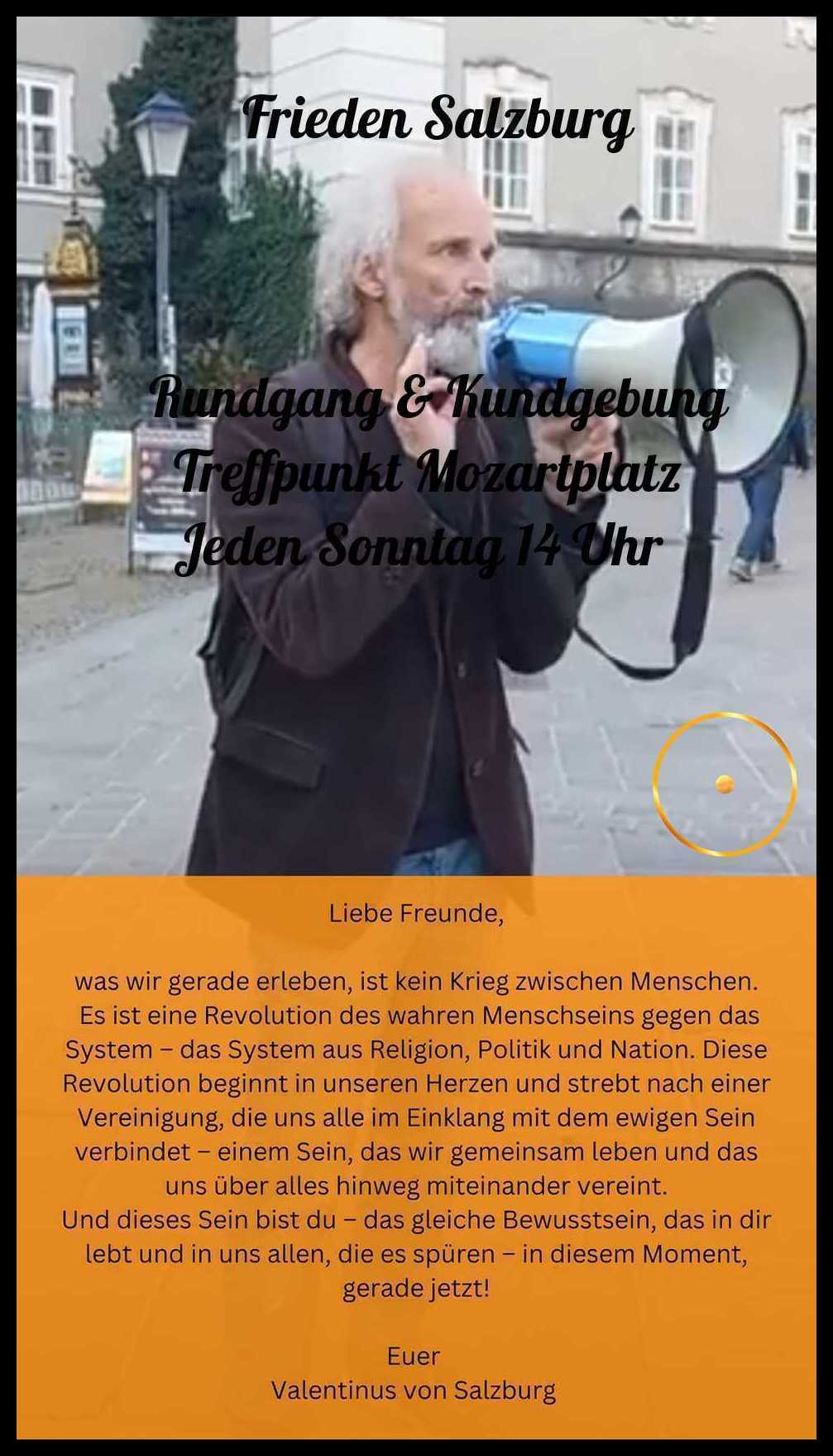 Friedens Spaziergang mit Kundgebung Salzburg - Treffpunkt Mozartplatz, jeden Sonntag 14 Uhr ! Liebe Freunde! Es ist von enormer Wichtigkeit, dass wir Visionen von der von uns gewünschten Welt entwickeln und versuchen, diese auch umzusetzen! Leider sehe ich bei einigen Menschen Resignation. Resignation führt oft in die Verzweiflung und endet in Untergangsfantasien. Das Aufdecken von Fakten ist enorm wichtig, doch müssen wir uns auch an unsere Schöpferkraft erinnern! Ansonsten besteht die Gefahr, dass wir, ohne es zu wollen, zu Mithelfern derer werden, dessen Machenschaften und Pläne wir gerade versuchen aufzudecken und zu durchkreuzen. Große Umarmung Euer Valentinus von Salzburg | |