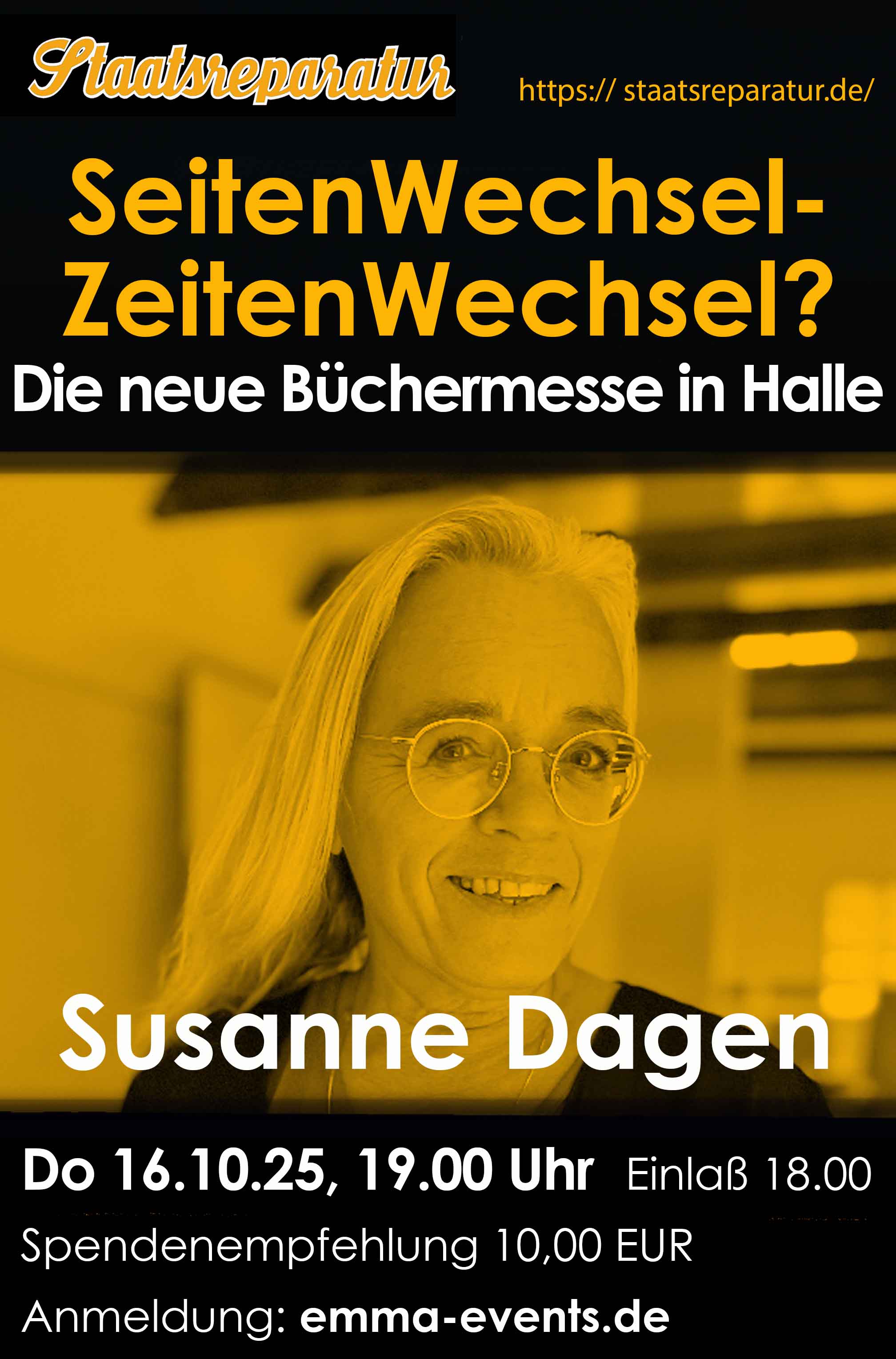 Susanne Dagen ist Buchhändlerin, Kulturveranstalterin, Verlegerin und Stadträtin in ihrer Geburtstadt Dresden. Sie führt seit 30 Jahren das BuchHaus Loschwitz. Im November 2025 veranstaltet sie als Reaktion auf die geistige und ideologisierte Ödnis bestehender Buchmessen in Frankfurt und Leipzig am 8. und 9. November 2025 die Büchermesse „SeitenWechsel“ in Halle an der Saale. Für ihre politischen Gegner gilt das vorab schon als Affront. Der „Kulturkampf“ ist im vollen Gange. www.buchhaus-loschwitz.de | |