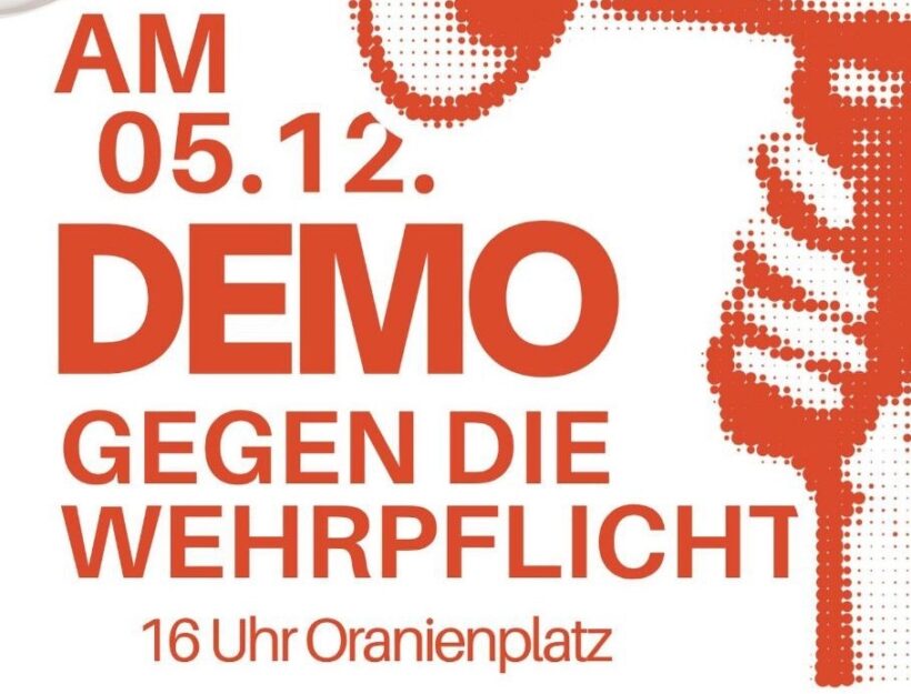 Die Regierungskoalition hat sich auf die Wiedereinführung der verpflichtenden Musterung geeinigt. Am 05. Dezember 2025 soll der Bundestag über die Änderungen am Wehrpflichtgesetz abstimmen. Verschiedene Jugendgruppen um die Kampagnen „Nein zur Wehrpflicht“ und „Komitees gegen die Wehrpflicht“ rufen daher in mehreren Städten zu einem bundesweiten Schulstreik an diesem Tag auf. ab 8 Uhr: Kundgebung am Platz der Republik Demonstrationszüge: Route ab 12 Uhr: Hallesches Tor Brücke - Wilhelmstr. - Franz-Klühs-Str. - Friedrichstr. - Rudi-Dutschke-Str.- Oranienstr. - Oranienplatz Route ab 16 Uhr: Oranienplatz - Oranienstr. - Adalbertstr. - Kottbusser Tor - Kottbusser Str. - Kottbusser Brücke - Kottbusser Damm - Hermannplatz - Karl-Marx-Str. Rathaus Neukölln Vorplatz https://www.berlin.de/polizei/service/versammlungsbehoerde/versammlungen-aufzuege/ -- | |
