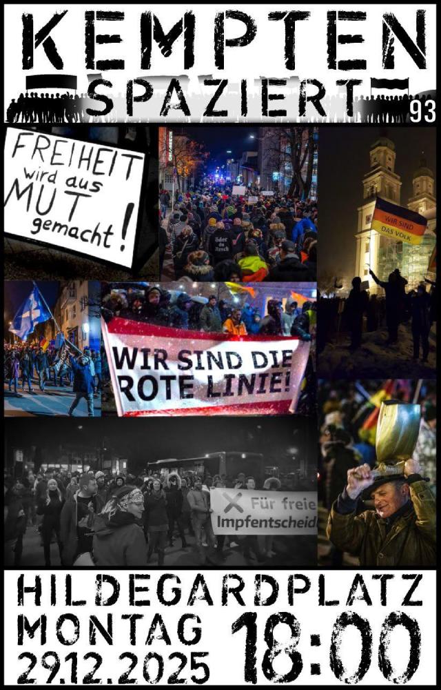 Die Jahre vergehen. Immer auf der Straße für Frieden, Freiheit und Selbstbestimmung. Viele Geschichten, Erlebnisse und Menschen, die uns begleitet und geprägt haben. Wir waren und sind die rote Linie! Der regelmäßige Spaziergang endet vielleicht am 29.12. aber wir sind nicht am Ende, denn wenn Unrecht zu Recht wird, wird Widerstand zur Pflicht und wir werden da sein! Denkt dran: Freiheit wird aus Mut gemacht! Zeigt nochmal Gesicht in Kempten, lasst uns gemeinsam ein Zeichen setzen. 29.12.2025. 18Uhr. Hildegardplatz. | |